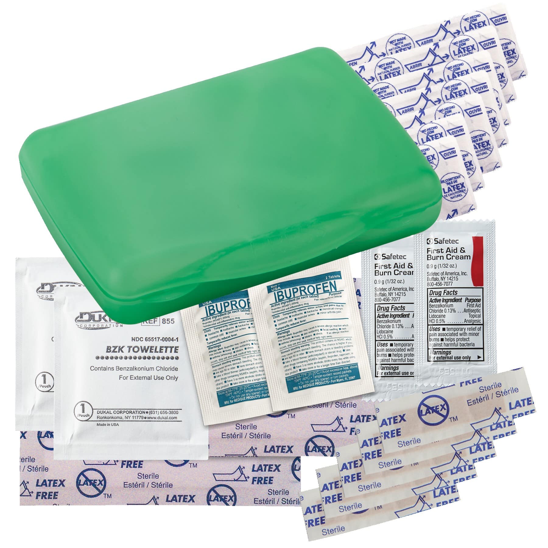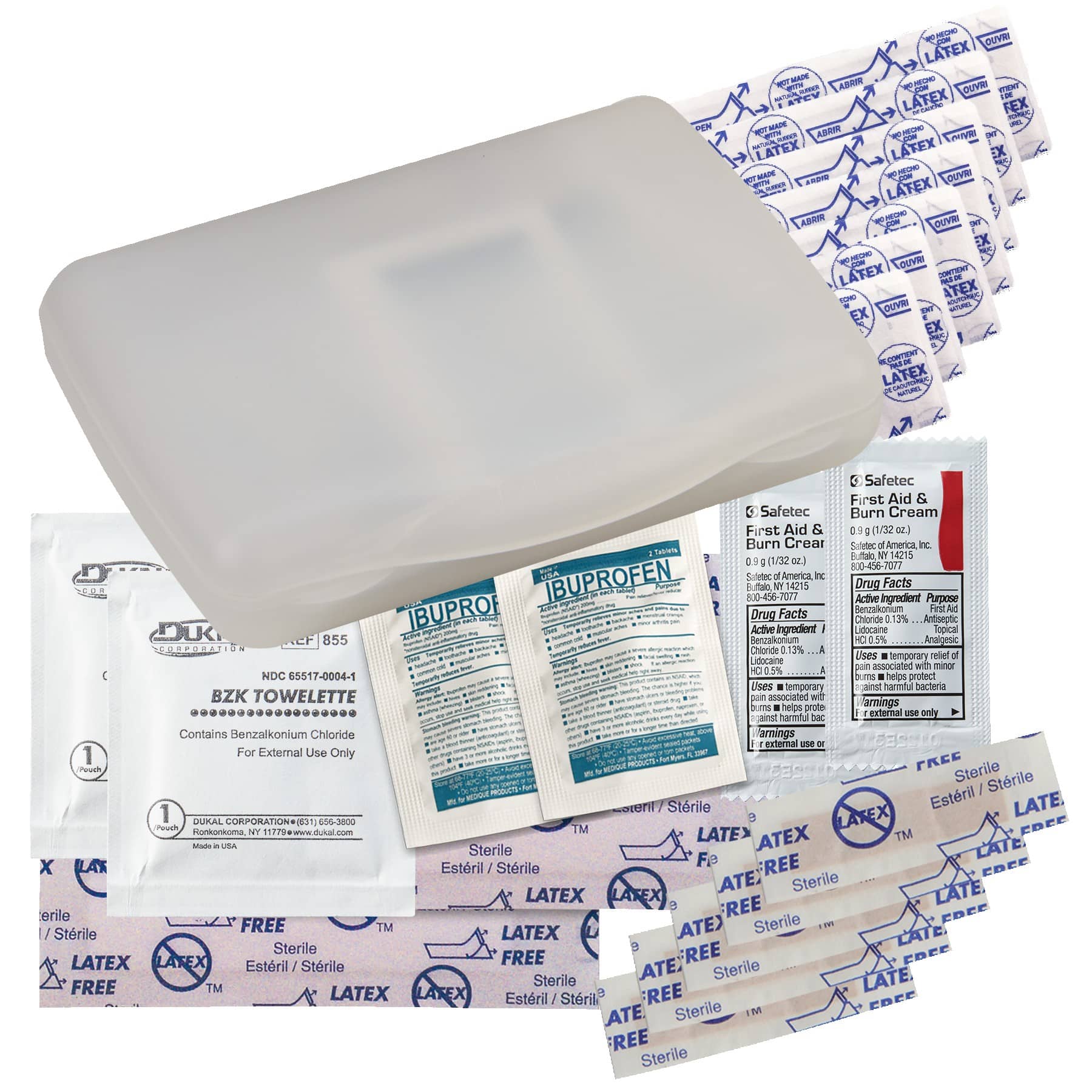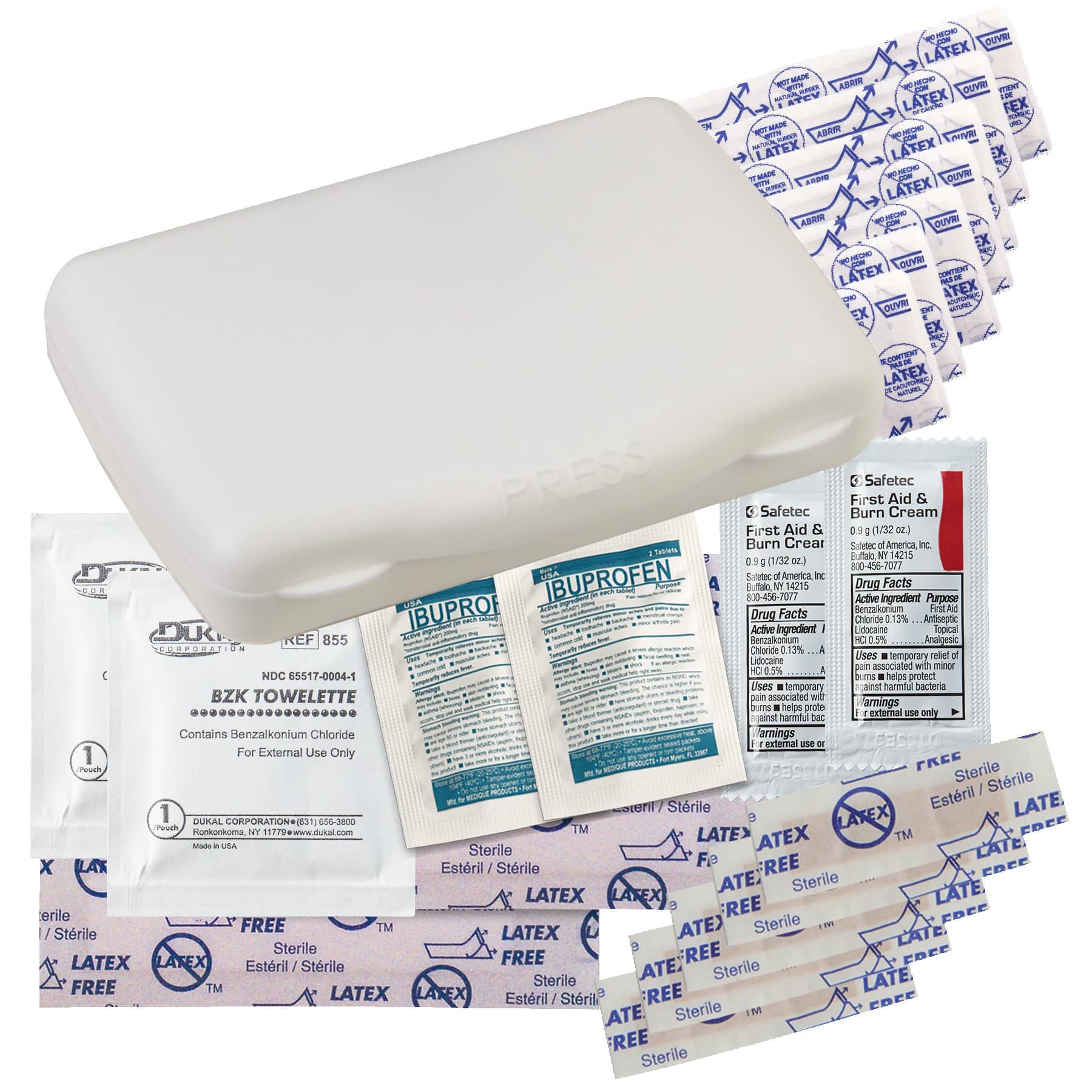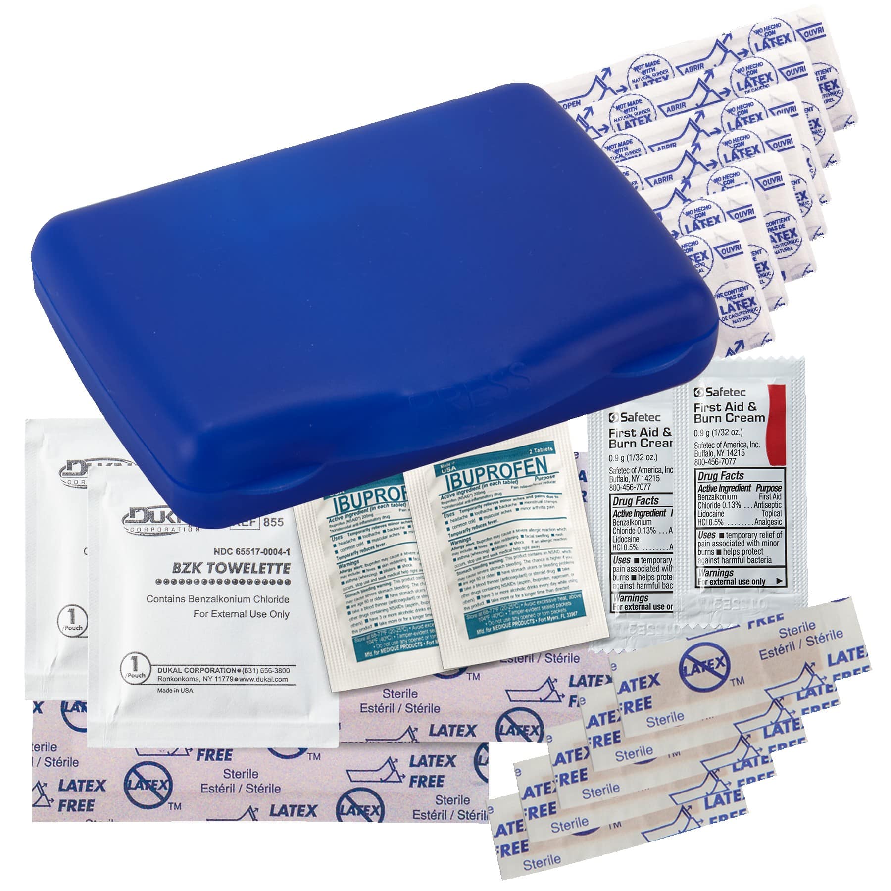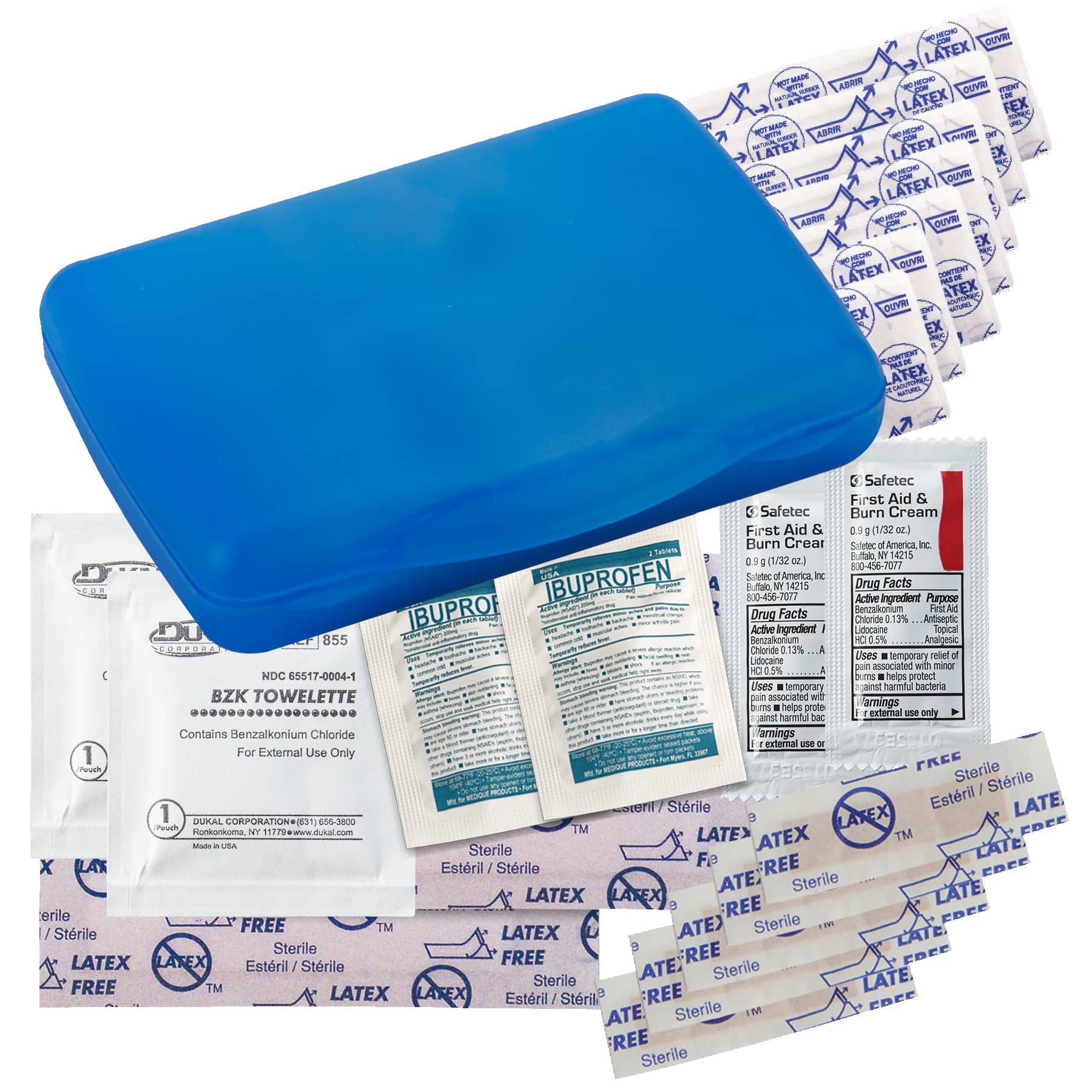 The comfort Care first aid kit contains almost everything other first aid kits wished they had in a convient travel size plastic case. Includes 7 latex-free bandages, 5 snip bandages, 2 antiseptic towelettes, 2 first aid cream packets, 2 – 2″ x 3″ adhesive pads, and 2 200 mg ibuprofen packets. This makes a perfect first aid travel kit due to its small size. 4 7/8″ W x 3 3/4″ H x 1″ D