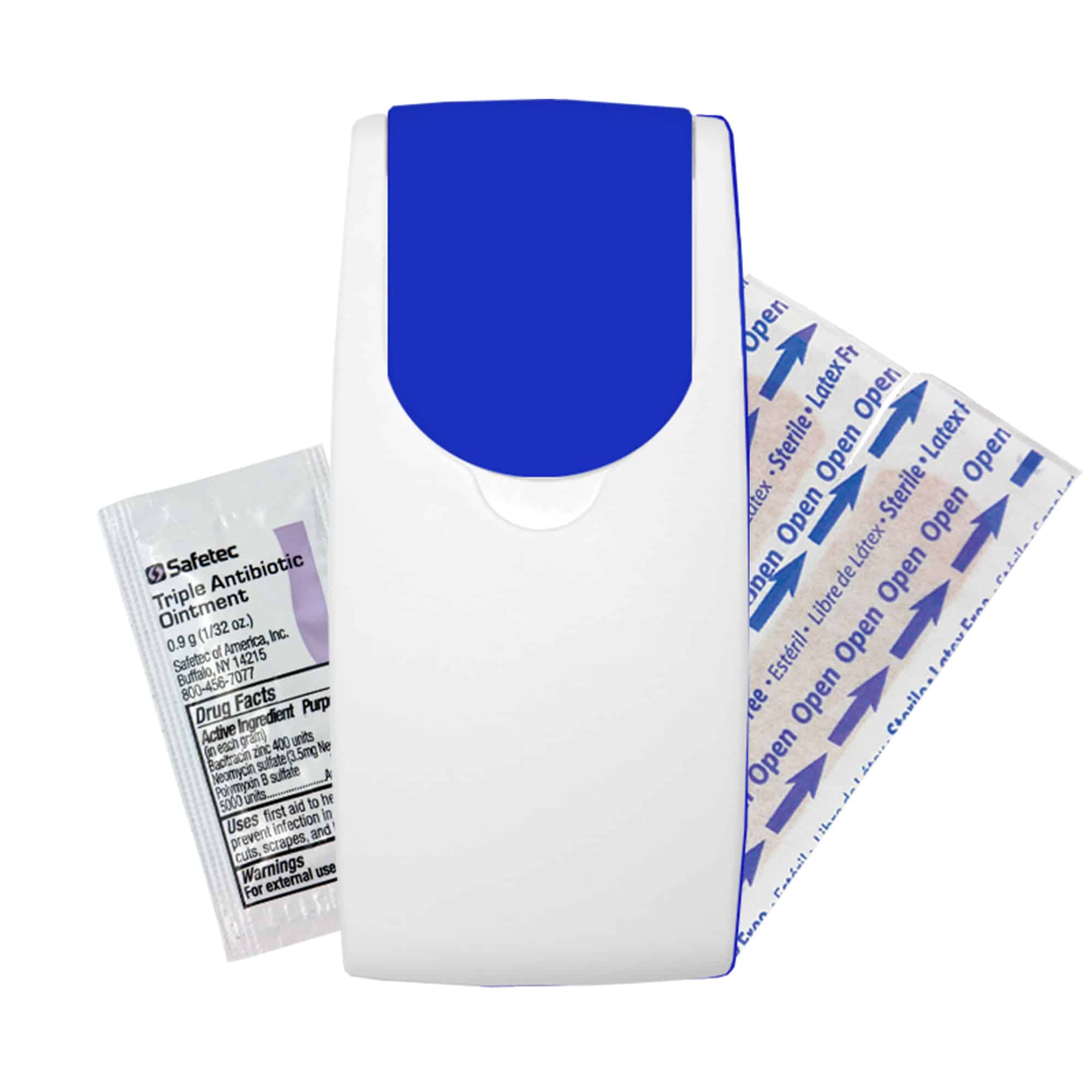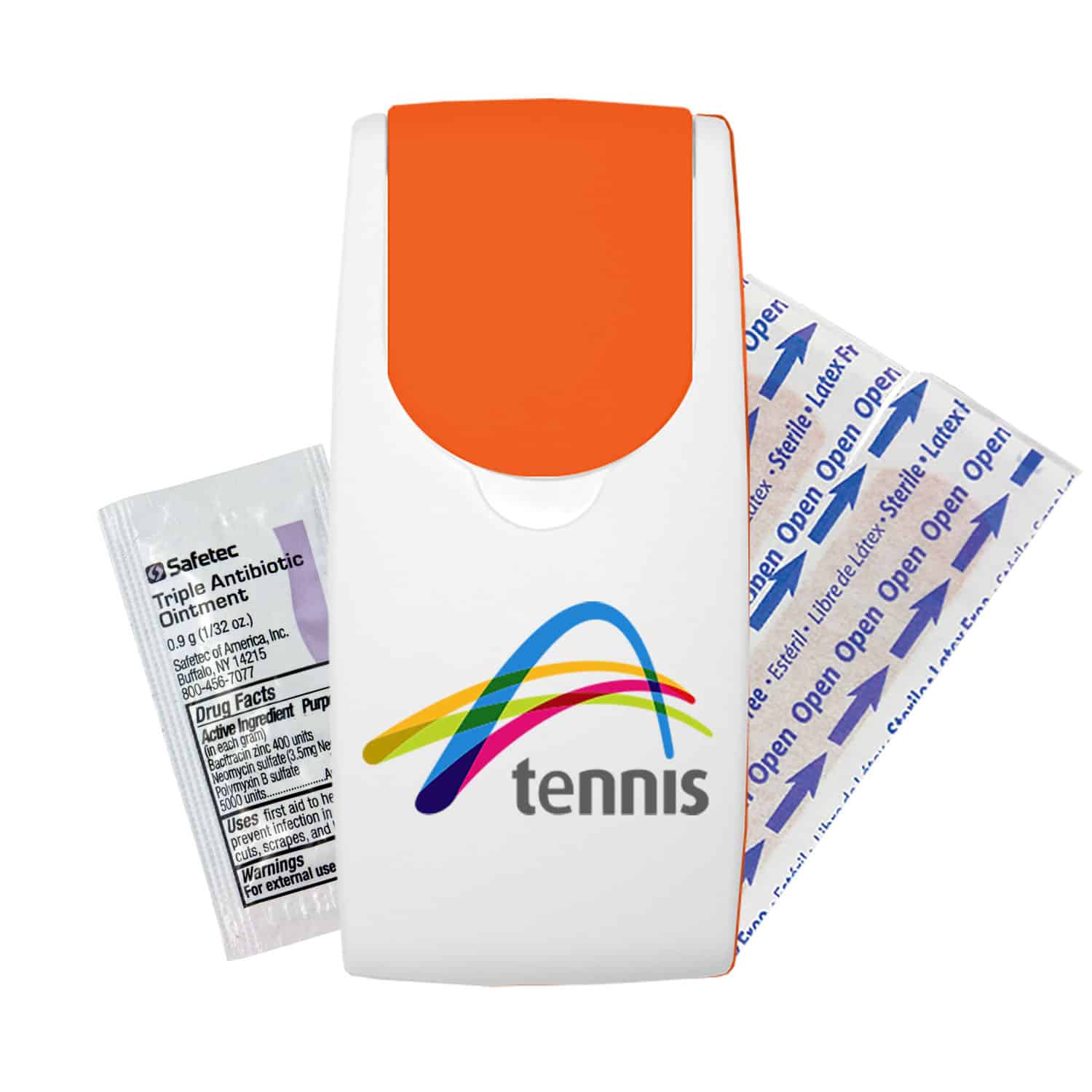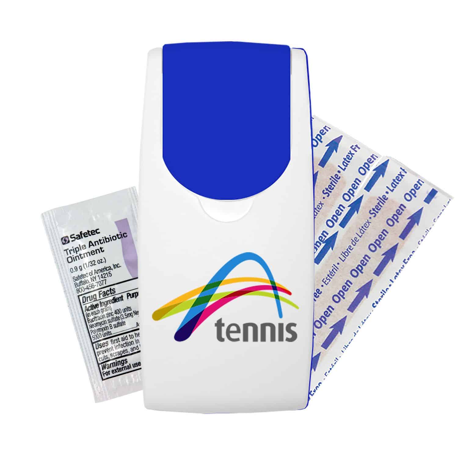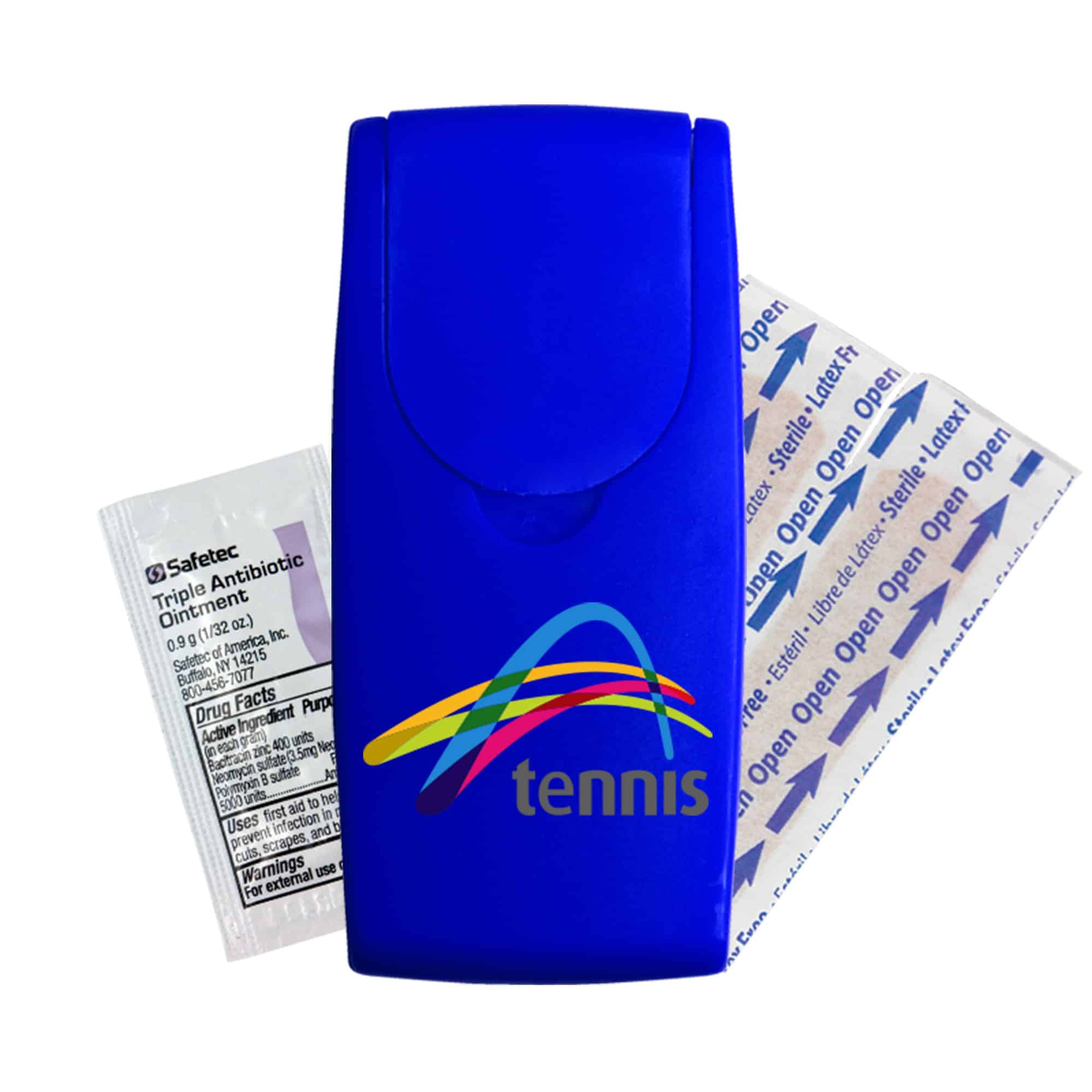 Don’t be caught unprepared in an emergencyThis first aid kit features a slim and convenient design that easily fits into backpacks. purses. and glove compartmentsContains four latex free bandages and a triple antibiotic ointmentA perfect giveaway item for summer camps and outdoor eventsMeasures 4 3/8″ x 2 1/16″ x 1/2″ in dimension with multiple imprint locations Individually polybagged. Complies with ANSI, CPSIA, FDA, Prop 65. 4 3/8″ H x 2.0625″ W x 0.5″ D